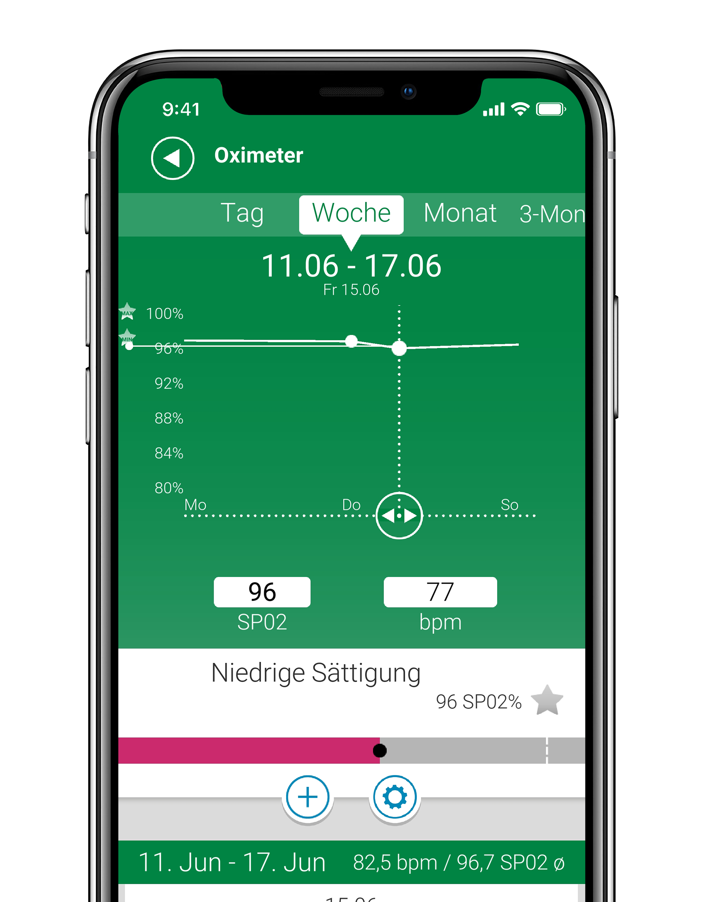 Pulse Oximeter measuring blood oxygen saturationComfortably measure blood oxygen saturation with the pulse oximeter and upload the results. More information